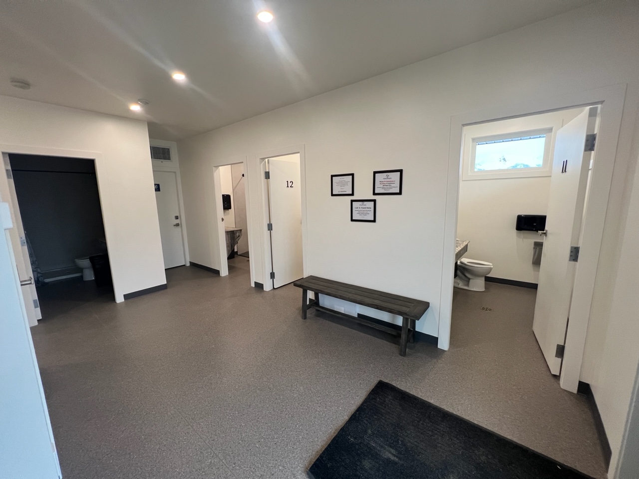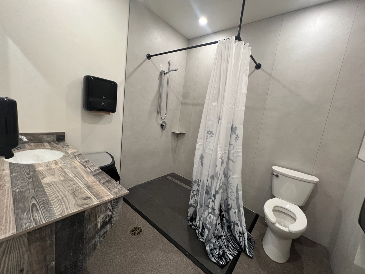 The new North washroom facility is bright and spacious and offers eight washroom stalls, with five having showers, including a handicap stall, to better serve our guests. We also will be adding a pet washing station to the exterior when the weather permits.